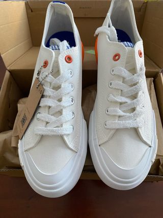 Playeras de lona blancas con detalles en color naranja. - Cordones blancos. - Ojales naranjas. - Suela de goma blanca.