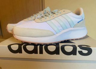 Zapatillas deportivas en color blanco y azul verdoso, talla 38. - Diseño clásico con las tres franjas. - Cordones a juego con el detalle de las franjas. - Suela de goma duradera.