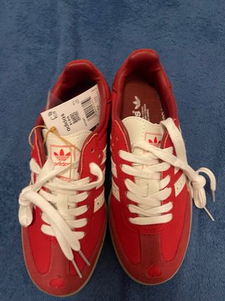 Zapatillas deportivas Adidas con un diseño clásico y llamativo. - Combinación de colores rojo y blanco. - Cordones blancos. - Detalle de las tres rayas. - Logo de Adidas en la lengüeta y el lateral.