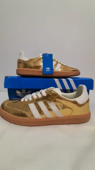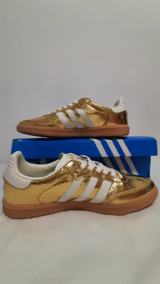 Zapatillas Adidas Samba con un llamativo acabado dorado y detalles blancos. - Diseño clásico de Adidas. - Suela de goma marrón. - Cordones blancos.
