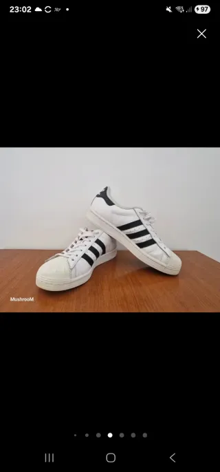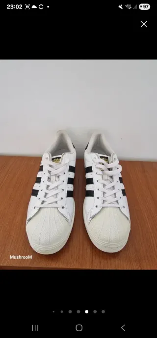 Clásicas zapatillas Adidas Superstar con un diseño icónico. - Parte superior de cuero blanco. - Rayas laterales negras. - Puntera de goma. - Cierre con cordones.