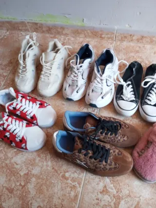 Variedad de zapatillas deportivas para mujer. - Zapatillas blancas de estilo casual. - Zapatillas deportivas con detalles en plateado. - Zapatillas con estampado de leopardo y cordones negros. - Zapatillas tipo Converse negras con cordones blancos.
