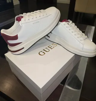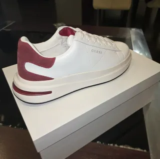 Zapatillas de la marca Guess, modelo ELBA. - Diseño moderno en blanco con detalles en burdeos. - Material exterior de cuero y ante. - Suela de goma con logo. - Cierre de cordones.