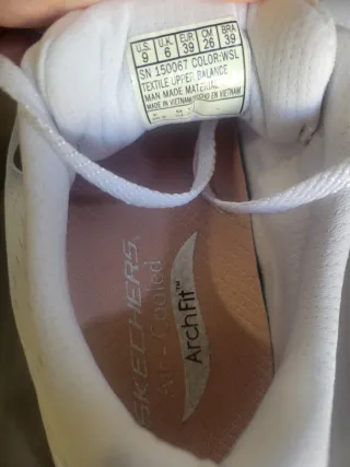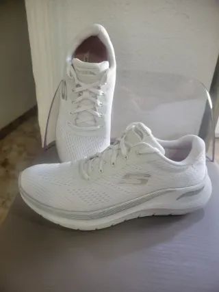 Zapatillas deportivas Skechers en color blanco con detalles plateados, muy cómodas. Se han usado 4 veces. Es una 39 pero la horma es como de una 40. Su precio nuevas es de 80€.