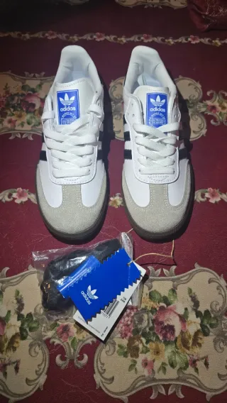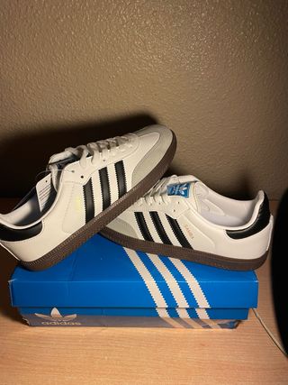 Zapatillas Adidas Samba OG en blanco y negro. Un clásico atemporal para tu día a día. - Diseño icónico con las tres rayas. - Suela de goma marrón. - Detalle de Samba en el lateral. lo único malo es la caja está un poco dañada pero todo está sin estrenar no utilizado por asuntos personales