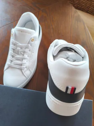 Zapatillas de estilo court de Tommy Hilfiger. - Detalle de ojales dorados. - Logo de la marca en dorado en el lateral y la lengüeta. - Combinación de blanco con detalles en negro en el talón.