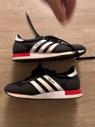 Zapatillas deportivas Adidas modelo USA 84. - Diseño clásico en color negro con detalles en blanco y rojo. - Tres rayas icónicas de Adidas en los laterales. - Suela de goma para mayor durabilidad.