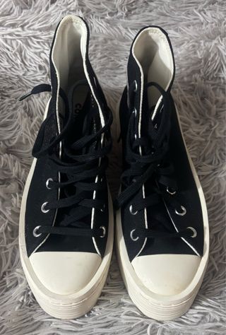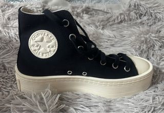 Zapatillas Converse de plataforma, color negro y blanco. Usadas solo una vez, se encuentran en excelente estado. - Diseño de caña alta. - Cordones negros. - Suela gruesa de plataforma.
