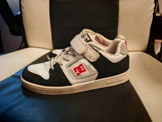 Zapatillas deportivas DC Shoes en talla 38. Combinan blanco y negro con detalles rojos. - Cierre con velcro y cordones. - Logo DC en rojo en el lateral. - Detalle de logo en la lengüeta. - Inscripción DCSHOECOUSA en la suela.