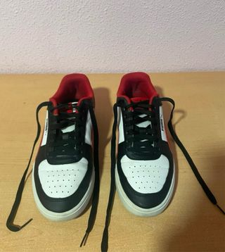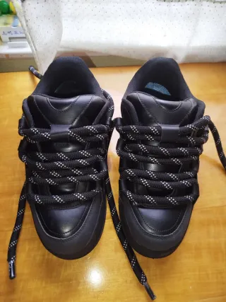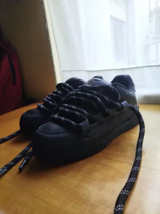 Vendo estas zapatillas deportivas/skater que compré en Bershka. ESTADO: Están completamente nuevas. Como se puede ver en las fotos, las vendo porque me quedan un número grandes y no pude cambiarlas/devolverlas a tiempo. Solo se han usado una vez. DISEÑO: Son de color negro mate con un diseño chunky (robustas/voluminosas) CORDONES: cordones gruesos de cuerda en color negro con motas blancas