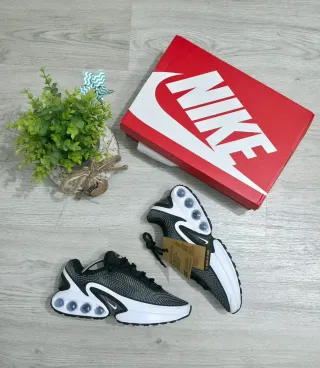 Zapatillas Nike Air Max DN con un diseño moderno y llamativo. - Combinación de colores negro y blanco. - Detalle de burbujas de aire en la suela. - Swoosh característico de la marca.