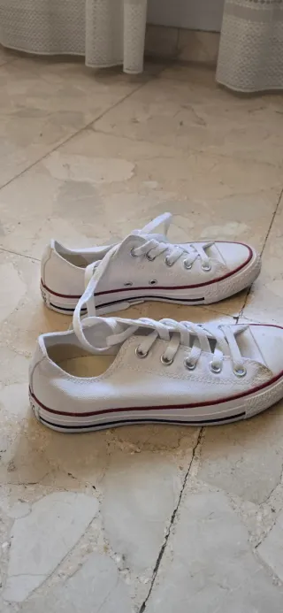 Zapatillas Converse blancas en perfecto estado, casi nuevas. Ideales para el día a día. - Diseño clásico de caña baja. - Cierre con cordones. - Suela de goma. - Detalle de línea roja en la suela.