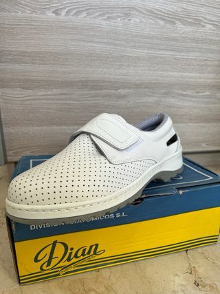 Zapato sanitario de la marca Dian, en color blanco y con cierre de velcro. - Diseño perforado para mayor transpirabilidad. - Suela de goma antideslizante. - Interior forrado en textil. - Antibacterial