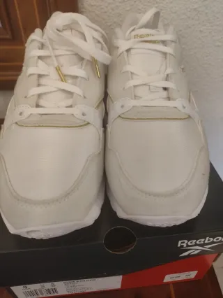 Zapatillas deportivas Reebok en color blanco con detalles dorados. - Diseño moderno y elegante. - Combinación de materiales. - Cierre con cordones. Solo usadas una vez,me equivoqué de talla y no las puedo utilizar