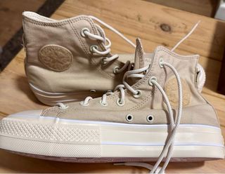 Zapatillas tipo botín de la marca Converse en color beige. Un clásico reinventado con plataforma. - Diseño de botín alto. - Cordones blancos. - Suela de plataforma gruesa, alta. ( Talla 33.5 de niña, modelo también para mujer con pie pequeño, (Nuevas) Precio negociable.