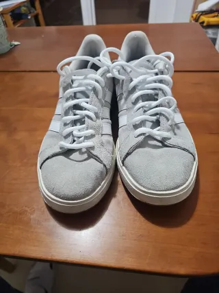 Zapatillas deportivas Adidas de gamuza en color gris con detalles blancos. - Diseño clásico de tres rayas. - Cordones blancos. - Suela de goma.