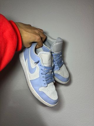 Zapatillas de la marca Jordan en tonos azul y blanco. Un diseño clásico y versátil. - Parte superior de cuero y gamuza. - Suela de goma para mayor tracción. - Cierre con cordones.