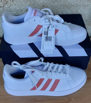 Zapatillas deportivas Adidas Grand Court Base 2. - Diseño clásico con las tres rayas. - Color blanco con detalles en salmón - Cierre de cordones. Con etiquetas y caja original