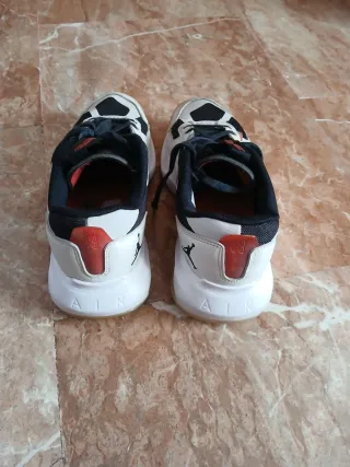Zapatillas deportivas Jordan de color rojo y blanco. - Diseño con paneles perforados. - Detalle del logo Jordan. - Suela con amortiguación visible.