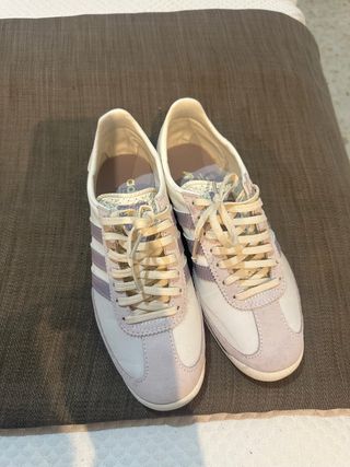 Zapatillas Adidas Samba originales para mujer. - Modelo Samba W. - Talla 40 (40 pequeño) EU / 6.5 UK / 250 JPN. - Color blanco con detalles verdes. NUEVAS A ESTRENAR. PRECIO NO NEGOCIABLE. CUALQUIER DUDA PREGUNTAME.