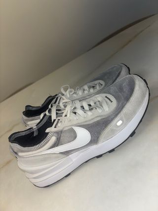 Zapatilla deportiva Nike en tonos grises y blancos. Diseño moderno y cómodo. - Parte superior de malla transpirable. - Suela de goma para mayor tracción. - Cierre con cordones.