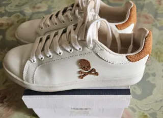 Zapatillas de estilo casual con un diseño moderno. - Exterior de cuero blanco. - Detalle de calavera bordada en marrón. - Refuerzo trasero en ante marrón.