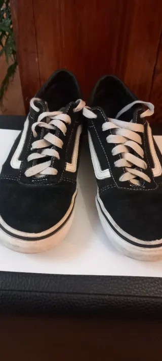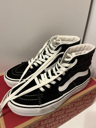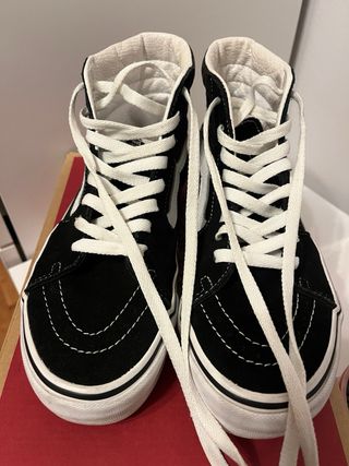 usadas una vez, sin caja original. con cordones blancos de recambio. uso la 38 y de largo me quedan bien pero m quedan estrechas porque tengo el pie ancho. la 38 me quedaba demasiado justa. por referencia, uso una 38 de vans y 38 y 2/3 Nike airforce 1