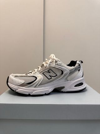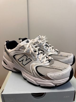 Zapatillas deportivas New Balance 530 con un diseño moderno y cómodo. - Combinación de colores plata y blanco. - Detalle del logo 'N' en el lateral. - Materiales de malla y sintéticos.