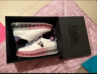 Zapatillas de la marca Karl Lagerfeld con un diseño moderno y llamativo. - Detalle de personaje Karl Lagerfeld. - Suela gruesa con efecto degradado rosa. - Cordones con efecto tie-dye. - Detalle trasero con acabado degradado.