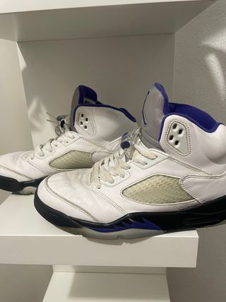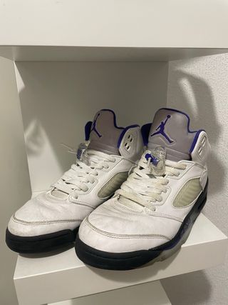 Zapatillas deportivas Jordan 5. - Exterior de cuero blanco. - Detalles en morado. - Suela negra.