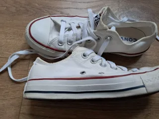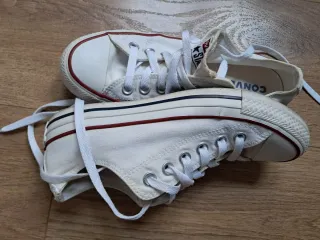 Vendo zapatillas Converse All Star blancas. Talla 35 - Cierre con cordones. - Banda lateral roja. - Logo de Converse en la lengüeta y el talón.