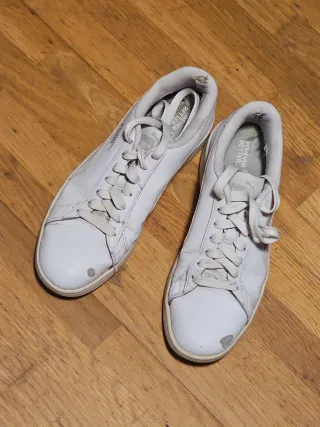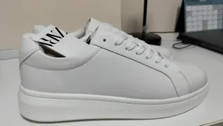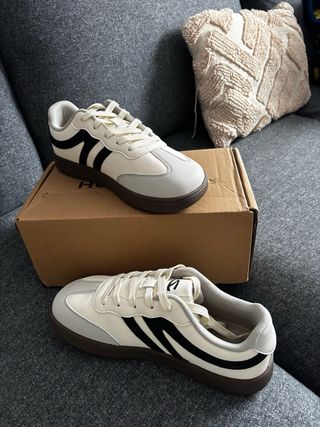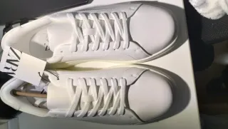 Zapatillas de estilo casual en color blanco y negro. - Diseño deportivo. - Suela de goma con grosor normal que permite flexibilidad y resistencia. - Cierre con cordones. - Materiales: cuero sintético. Piel imitación curtida vegetal. - Impermeables. Nunca se han usado ya que pedí una talla de más.