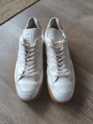 Zapatillas de la marca Veja, modelo V12. - Exterior de cuero blanco. - Detalle del logo lateral en ante beige. - Suela de goma natural color caramelo. - Cierre con cordones. Zapatillas con poquísimo uso como se ve.estan muy cuidadas.cordones cortados para que no se vean porque queda más vistoso.prexio nuevas última foto.las dejo por la mitad.