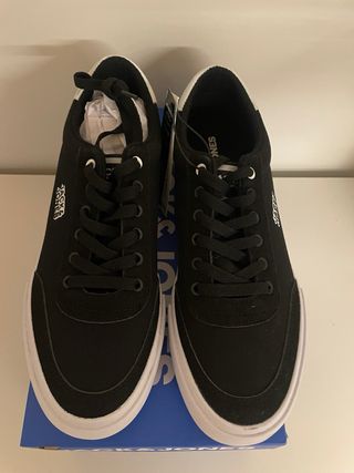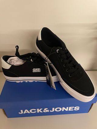 Zapatillas de la marca Jack & Jones en talla 43. Combinan un diseño clásico con detalles modernos. - Exterior en tela negra. - Detalle de puntera y talón en blanco. - Suela de goma blanca. - Cierre con cordones.