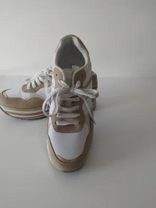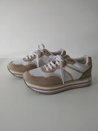 Zapatillas deportivas con un diseño moderno y cómodo. No hago envíos - Combinación de colores beige y blanco. - Suela gruesa con detalles de rayas. - Cierre con cordones blancos.