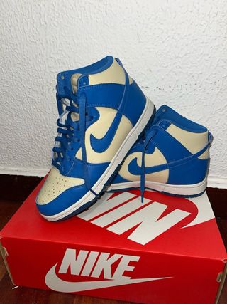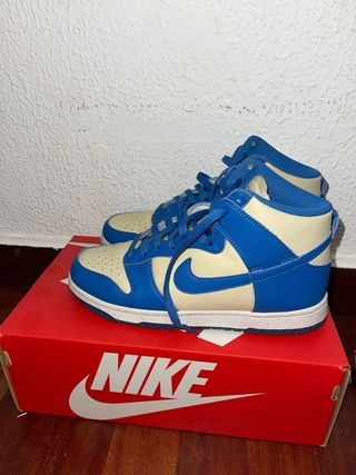 Zapatillas altas de la marca Nike en una combinación de colores beige y azul. Perfectas para un estilo urbano y casual. Con caja incluida - Diseño de caña alta. - Cordones a juego con el color azul. - Suela blanca con detalles salpicados.