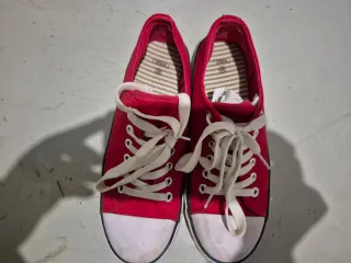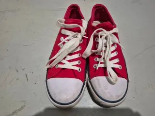 Zapatillas de lona rojas, perfectas para el verano. Son cómodas y versátiles. - Cierre con cordones blancos. - Punta reforzada. - Suela de goma.