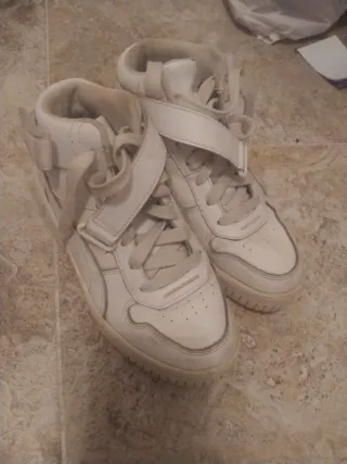 Zapatillas Nike Air Force 1, de color blanco. Son de caña alta y tienen cierre de velcro. Están en buen estado, aunque presentan algunas señales de uso. Se incluyen dos zapatillas. - Modelo: Air Force 1 - Caña alta - Cierre de velcro