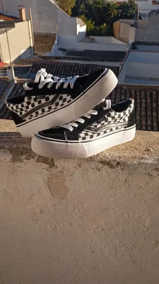Zapatillas deportivas de color negro con cordones. Son de lona y tienen una suela blanca. Están en buen estado. - Ideales para el día a día. - Cómodas y ligeras. - Suela de goma resistente.