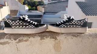 Zapatillas de plataforma con un diseño a cuadros llamativo. - Estampado de cuadros en blanco y negro. - Suela de plataforma gruesa. - Cordones blancos.
