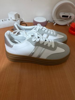 Zapatillas plataforma de Bershka en color dorado y blanco, talla 37. Son unas zapatillas con estilo llamativo. - Ideales para darle un toque brillante a tu look. - Diseño de plataforma. - En buen estado.
