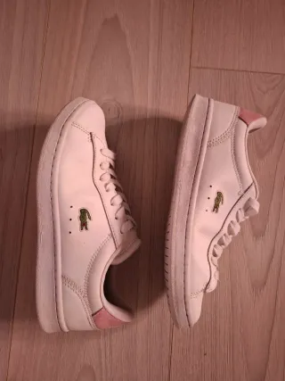 Zapatillas deportivas de mujer de la marca Lacoste. - Diseño en color blanco con detalles en rosa. - Logo de Lacoste visible en el lateral. - Pequeños signos de zapatillas usadas ( se ve en las fotos)