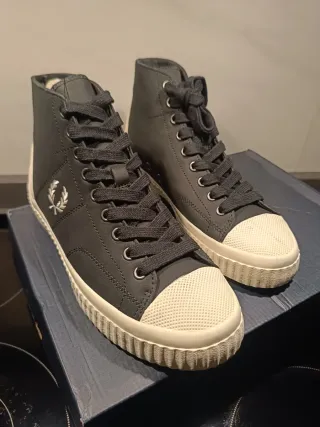 Zapatillas altas de cuero Fred Perry en tonos grises y blancos. Un diseño clásico y versátil. - Detalle del logo de Fred Perry bordado. - Punta reforzada en tejido blanco. - Suela de goma con relieve. En tienda oficial 135 euros