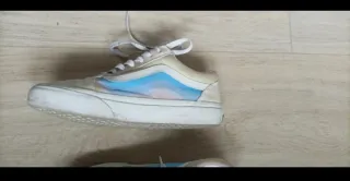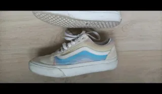 Zapatillas Vans con un diseño llamativo y colorido. - Combinación de colores blanco, azul y tonos pastel. - Estilo clásico Old Skool. Número 36'5