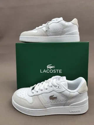 Zapatillas de estilo urbano con un diseño moderno. - Combinación de materiales en blanco y beige. - Detalle del logo de Lacoste en el lateral. - Cierre con cordones.