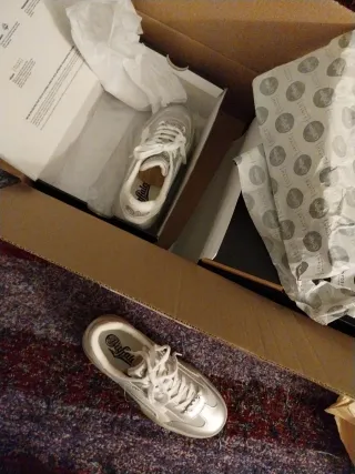 Zapatillas de mujer de la marca Buffalo, a estrenar. Mi pareja se equivocó de talla. - Diseño moderno con detalles plateados. - Combinación de blanco y plateado.