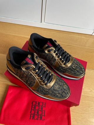 Preciosas zapatillas Carolina Herrera, talla 36, completamente nuevas. Son de color negro y dorado, con un diseño elegante y brillante. - Material de alta calidad. - Diseño moderno y sofisticado. - Perfectas para cualquier ocasión.