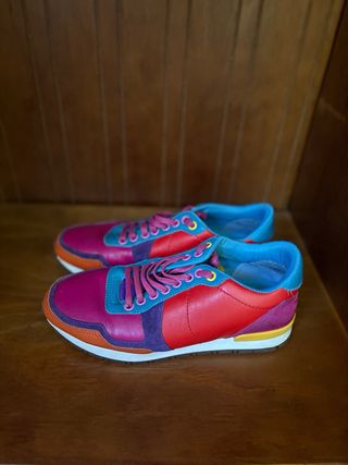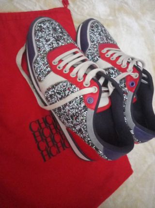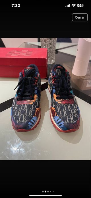 Zapatillas de la marca Carolina Herrera con un diseño llamativo. - Combinación de colores rojo y multicolor. - Estampado CH en varias partes de la zapatilla. -En perfecto estado. -muy cómodas.