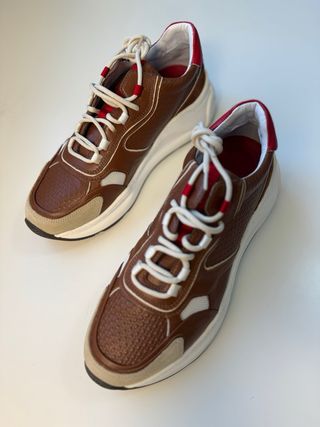 Zapatillas de caballero de la marca Carolina Herrera. - Diseño moderno en tonos marrón y detalles en rojo. - Combinación de materiales en el exterior. - Cordones blancos. - Suela de goma blanca.