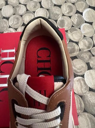 Con Factura de compra totalmente originales valoradas en 260€ Elegantes zapatillas de Carolina Herrera con un diseño distintivo. - Combinación de colores beige y marrón. - Detalle del logo CH repetido en el tejido. - Puntera y talón en ante marrón. - Detalle en rojo en el talón.
